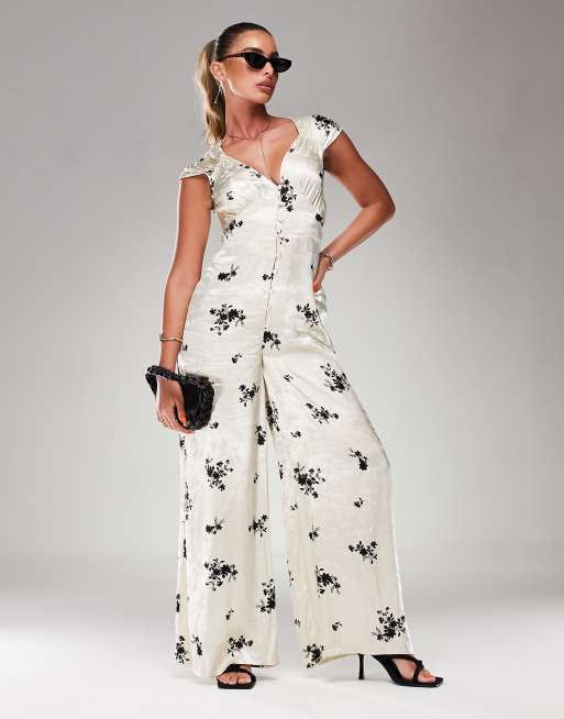 ASOS DESIGN - Jumpsuit van satijn jacquard met bloemenprint in ivoorwit