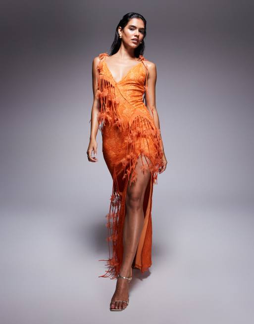 ASOS DESIGN - Kanten maxi jurk met dunne bandjes, 3D-bloemen en franje in oranje