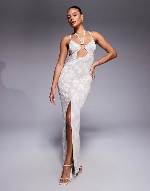 ASOS DESIGN - Kanten maxi jurk met textuur en goudkleurige metalen accenten in crème