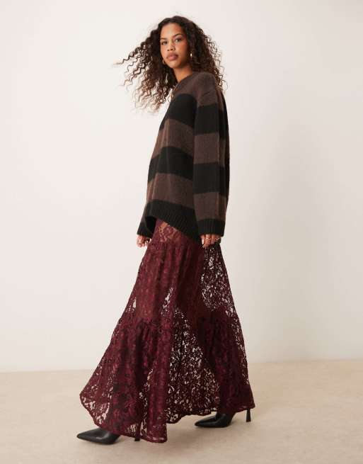 ASOS DESIGN - Kanten maxi rok met stroken in bordeauxrood