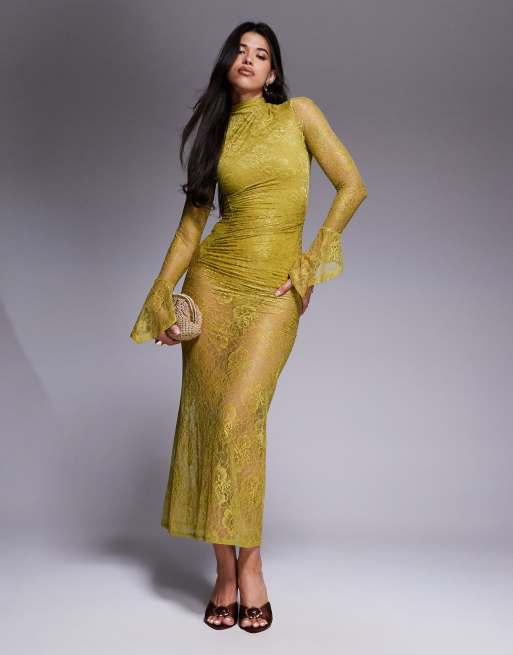 ASOS DESIGN - Kanten midi-jurk met hoge hals en asymmetrische uitlopende boorden in chartreuse