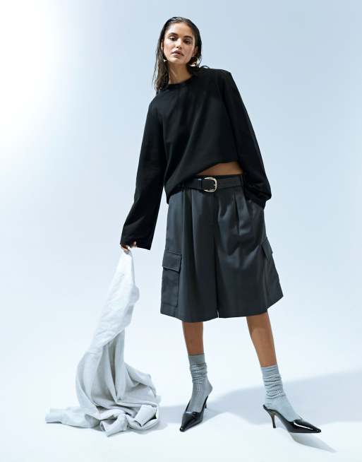 ASOS DESIGN - Katoenen top met ronde hals, lange mouwen en schoudervullingen in zwart