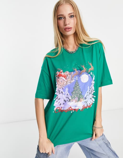 ASOS DESIGN - Kerstmis - Oversized T-shirt met schilderachtige kerstmanprint in groen
