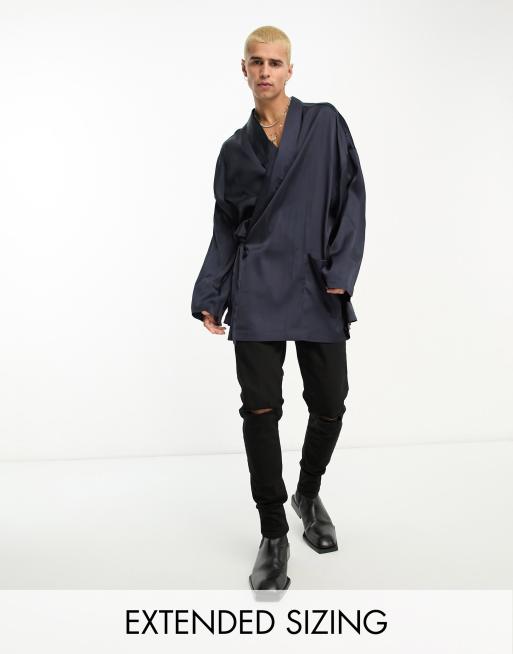 ASOS DESIGN - Kimono van satijn met overslag in marineblauw