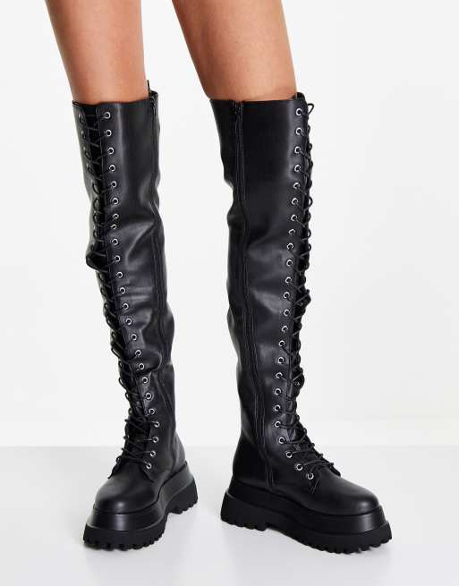 ASOS DESIGN - Kindly - Over-de-knie-veterlaarzen met dikke zool in zwart