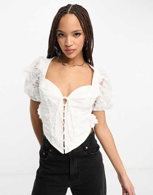 ASOS DESIGN - Korsettop met gestrikte voorkant en pofmouwen in wit met 3D gebloemd kant