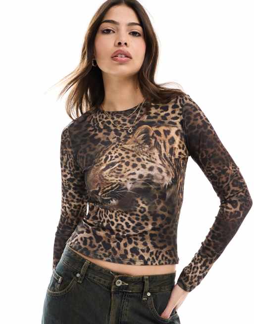 ASOS DESIGN - Kort T-shirt van mesh met lange mouwen en luipaardprint