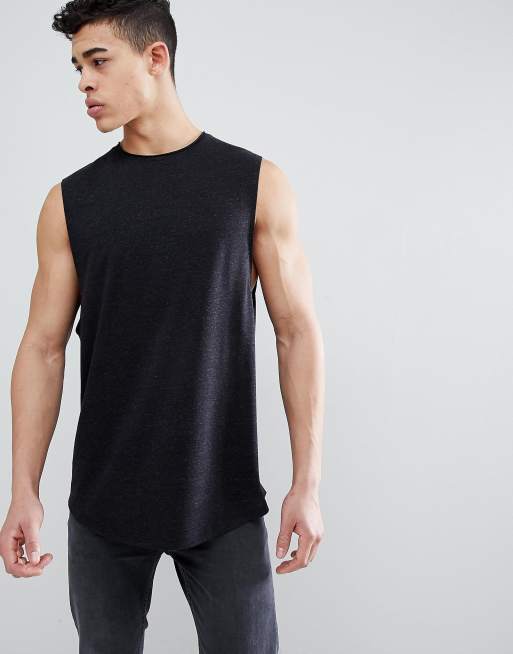 ASOS Design - Lang mouwloos T-shirt met onafgewerkte hals en ronde zoom, van linnenmix in zwart