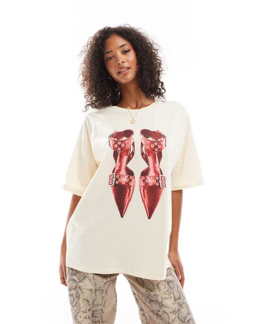 ASOS DESIGN - Lang T-shirt met kitten heel-print in ecru