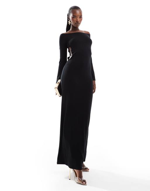ASOS DESIGN - Lange bardotjurk met uitsnijding en afwerking in zwart