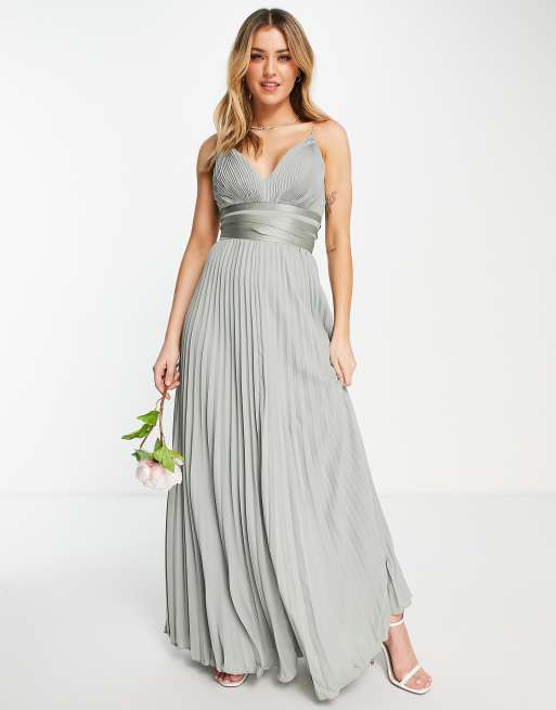 ASOS DESIGN - Lange bruidsmeisjesjurk met plooien, dunne bandjes en satijnen wikkelbandjes om de taille in olijfgroen