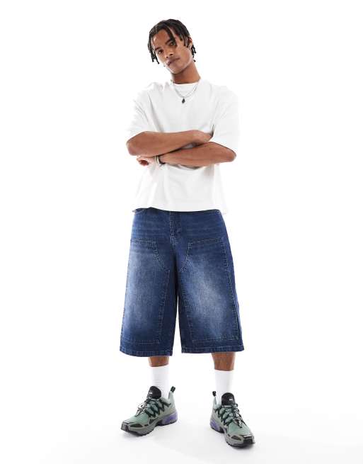 ASOS DESIGN - Lange denim jorts met patch in mid-wash blauw