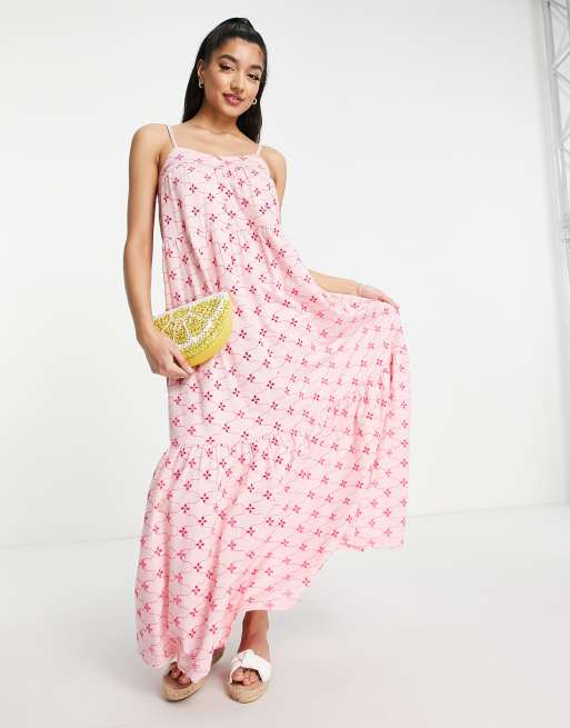 ASOS DESIGN - Lange jurk met broderie, smalle bandjes en knopen in roze met contrast