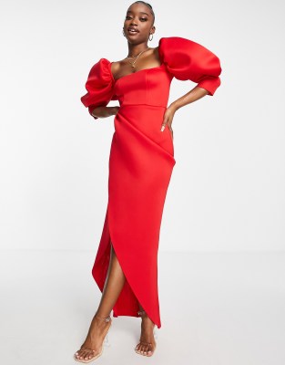 ASOS DESIGN - Lange jurk met overslag en pofmouwen in rood