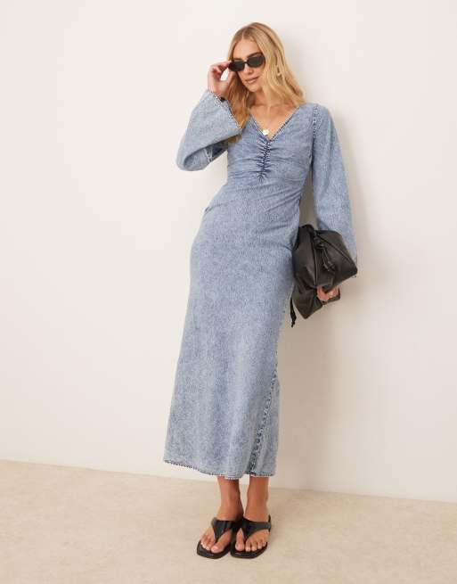 ASOS DESIGN - Lange jurk met V-hals, gerimpelde buste en uitlopende mouwen in denim wash blauw