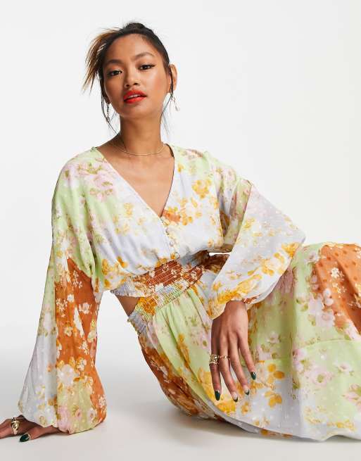 ASOS DESIGN - Lange jurk van dobbystof met gesmokte taille en open achterkant in patchwork van bloemenprintjes