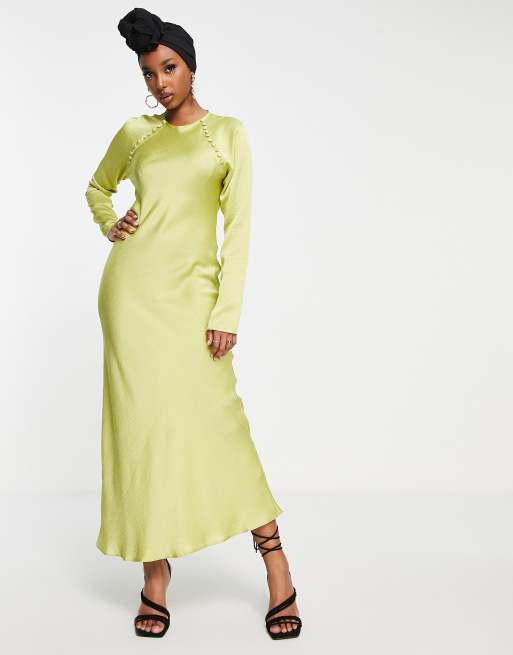 ASOS DESIGN - Lange jurk van schuin gesneden satin met knoopjes in limoengroen