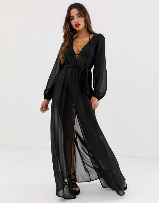 ASOS DESIGN - Lange strandkimono van chiffon met lange mouwen, overslag en strikband in zwart