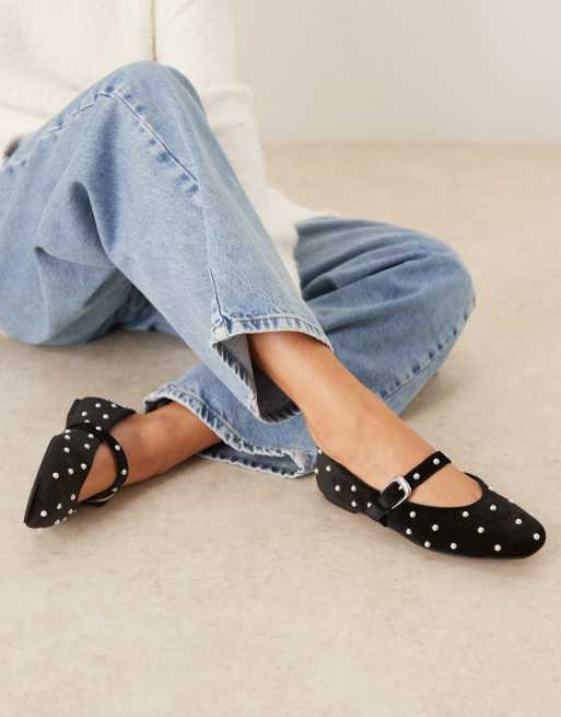 ASOS DESIGN - Leah - Fluwelen Mary Jane ballerina's met pareldetail in zwart