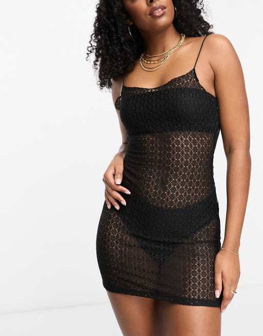 ASOS DESIGN - Lichte, gebreide mini cami strandjurk in zwart met goudkleurige ketting op de rug