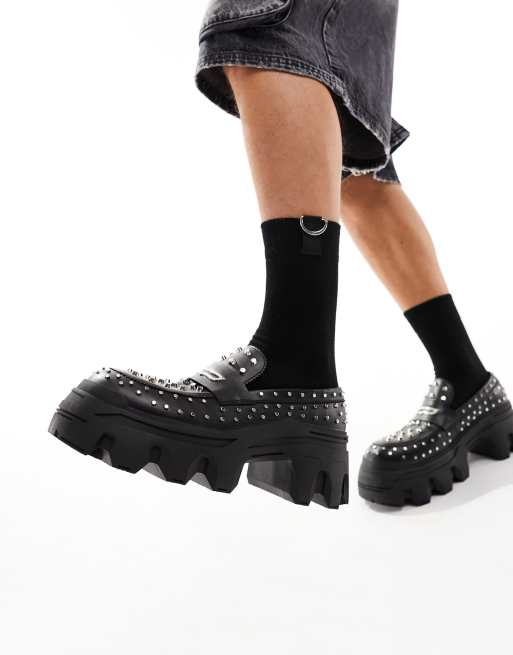 ASOS DESIGN - Loafers met dikke zool in zwart imitatieleer met zilveren studs