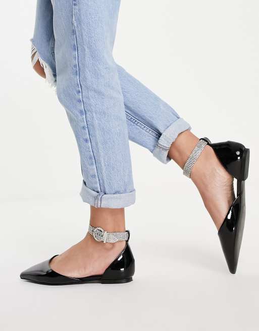 ASOS DESIGN - Lustful - Lakleren ballerina's met enkelbandjes met strass in zwart