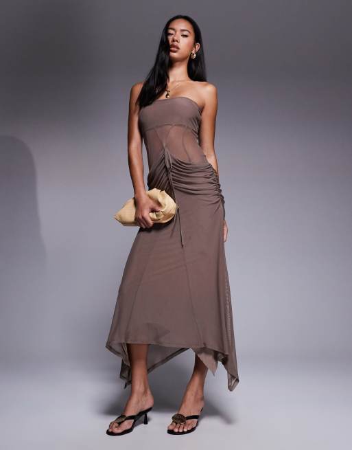 ASOS DESIGN - Maxi bandeau-jurk met mesh korset in chocoladebruin