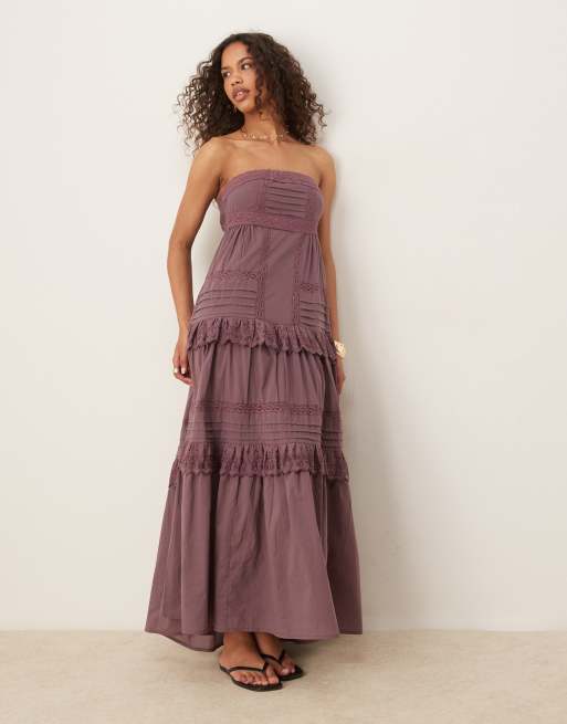 ASOS DESIGN - Maxi bandeau-jurk met plat gestikte plooien en kanten lagen in dieppaars