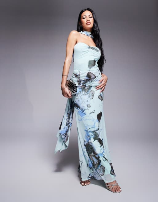 ASOS DESIGN - Maxi bandeau-jurk van mesh met gedrapeerde achterkant en sjerpdetail in blauw met bloemenprint