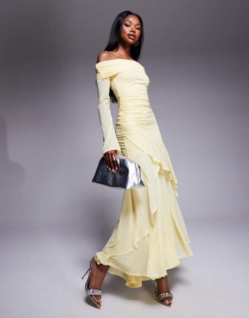 ASOS DESIGN - Maxi-bardotjurk van chiffon met stretch, lange mouwen en ruches aan de zoom in geel