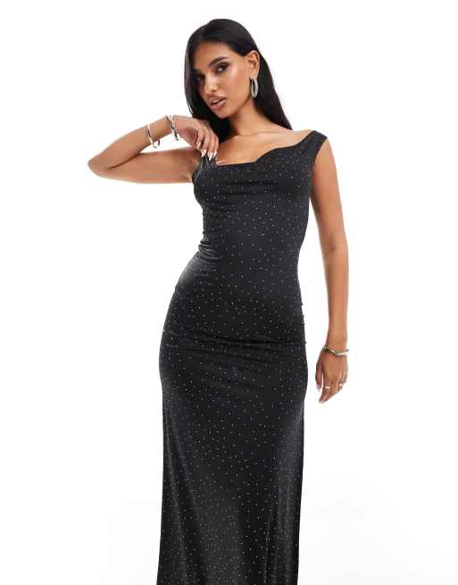 ASOS DESIGN - Maxi jurk met asymmetrische halslijn en hotfix glinstering in zwart
