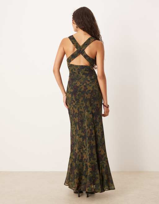 ASOS DESIGN - Maxi-jurk met bandjes aan de achterkant en ruches aan de zomen in bloemenprint