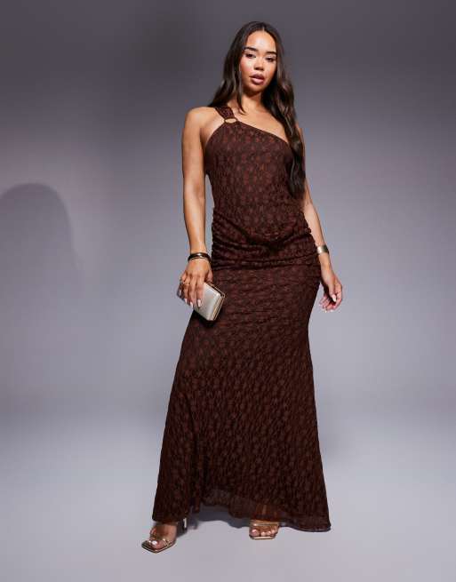 ASOS DESIGN - Maxi-jurk met blote schouder en ringdetail en plooidetail in bruin