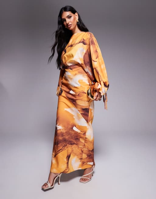 ASOS DESIGN - Maxi jurk met blousonmouwen, plooien, gestrikt detail en oversized bloemenprint in roestbruin