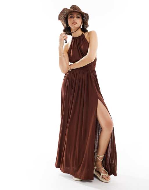ASOS DESIGN - Maxi jurk met halternek en gerimpelde taille in chocoladebruin