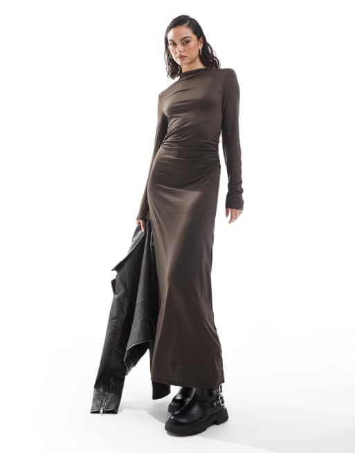 ASOS DESIGN - Maxi jurk met hoogsluitende gedrapeerde halslijn in chocoladebruin