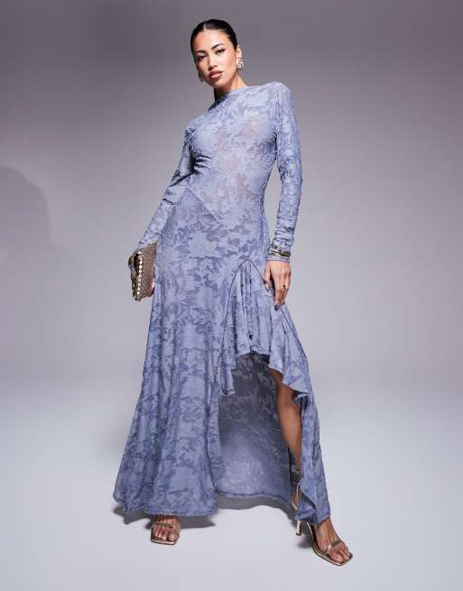 ASOS DESIGN - Maxi-jurk met ongelijke zoom en open achterkant in blauw devore