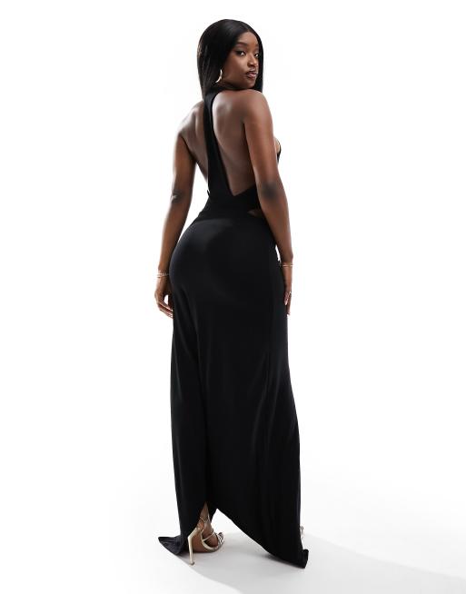 ASOS DESIGN - Maxi-jurk met racerhals, open achterkant en asymmetrische zoom in zwart