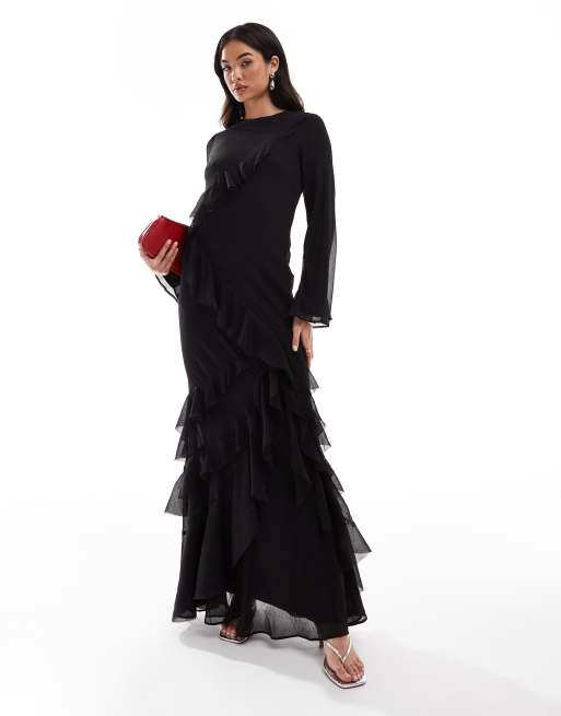 ASOS DESIGN - Maxi-jurk met uitlopende lange mouwen en extreme ruches in zwart