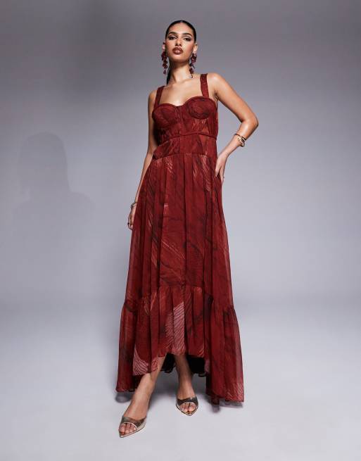 ASOS DESIGN - Maxi jurk met vlechtdetail en bustecups in rode abstracte print