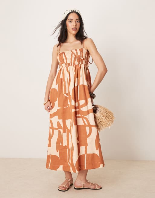 ASOS DESIGN - Maxi-jurk van katoen satinet met gesmokte buste in abstracte print