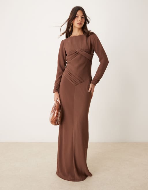 ASOS DESIGN - Maxi jurk van kreukelstof met gerimpelde buste in chocoladebruin