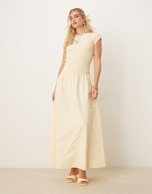 ASOS DESIGN - Maxi jurk van popelinemix met textuur, verlaagde zoom en kapmouwtjes in lichtgeel