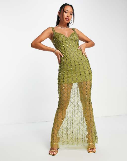 ASOS DESIGN - Maxi slipdress versierd met lovertjes in olijfgroen