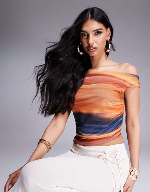 ASOS DESIGN - Mesh top met blote schouders en abstracte print in multi strepen