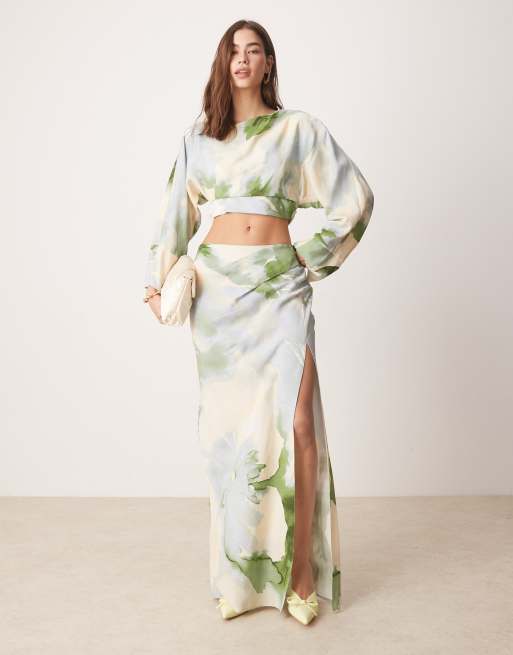 ASOS DESIGN - Midaxi jurk met afhangende schouder, bloemenprint en uitsnijding in multi