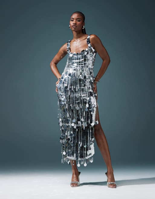 ASOS DESIGN - Midaxi jurk met franjes en lovertjes in zilver