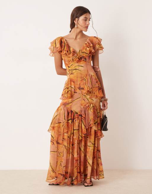 ASOS DESIGN - Midaxi-jurk met lage ronde hals, fladdermouwen, ruches, stroken en bloemenprint in geel