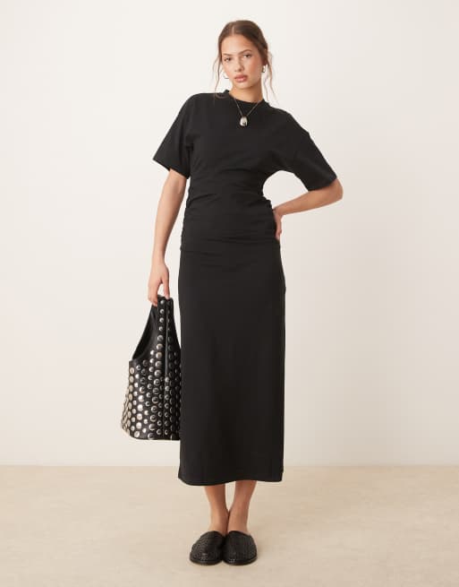 ASOS DESIGN - Midaxi T-shirtjurk met ronde hals en gerimpelde zijkanten in zwart