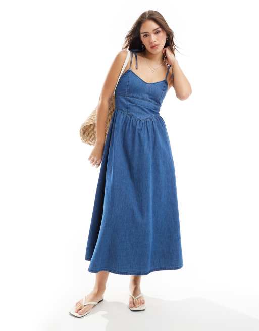 ASOS DESIGN - Midi ballerina-jurk van zacht denim in mid-wash blauw